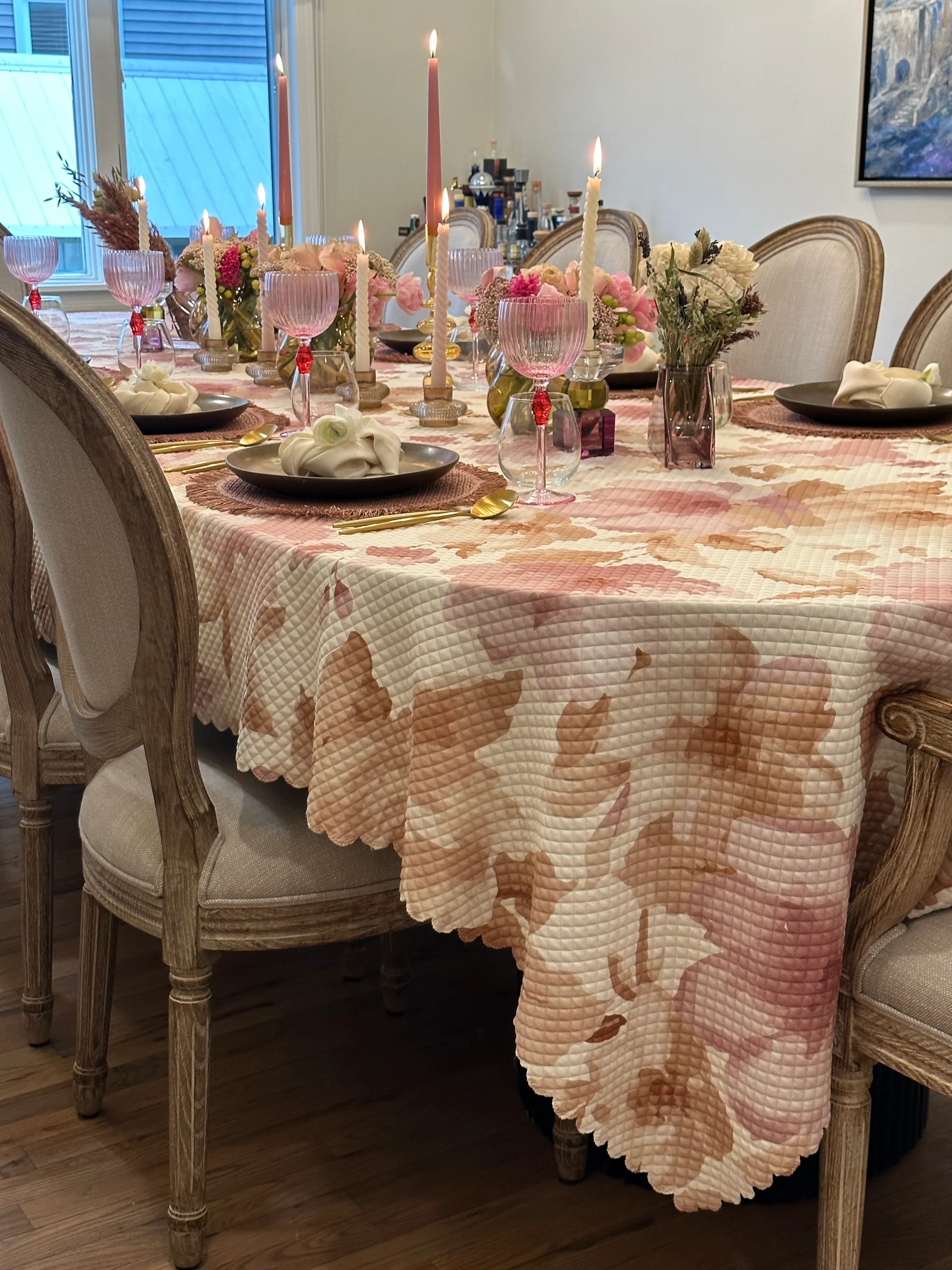 This tablecloth we incorporated our classic white scalloped cloth with a more fun vibrant watercolor design to bring in the spring days